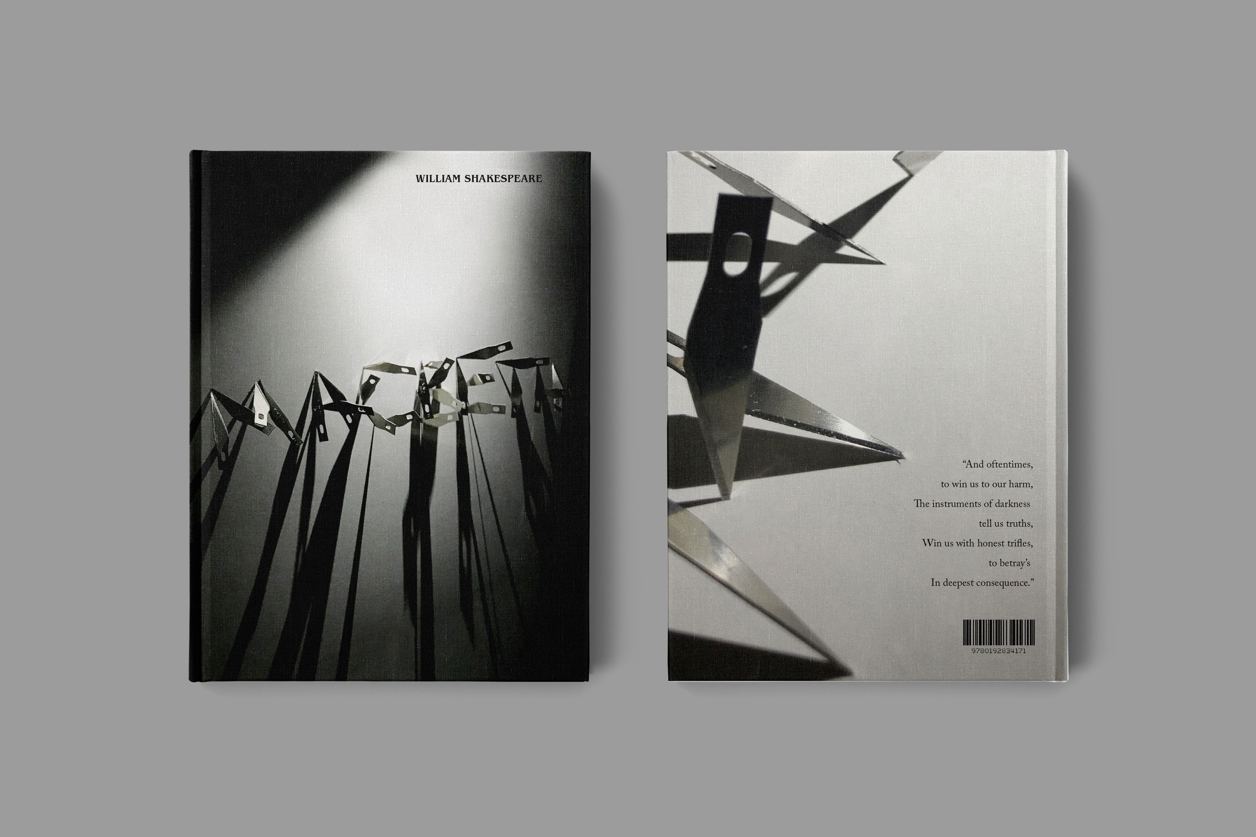 Taking about 25 X-ACTO knife blades and a foam board, I utilized light and shadow to create a foreboding composition for the cover of William Shakespeare’s play Macbeth. The blades spell "MACBETH" at an angle, casting long shadows underneath an implied stage light, symbolizing how Macbeth's violent actions caused his downfall.